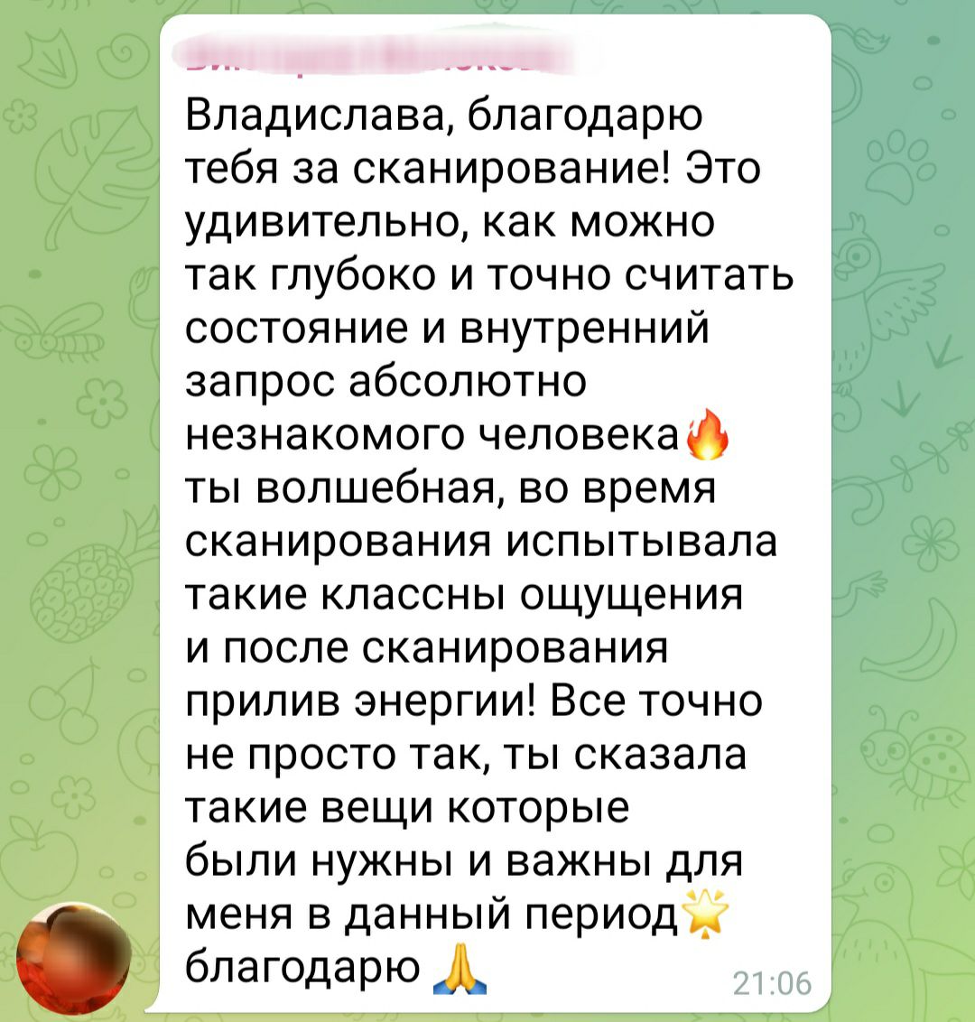 “Владислава, благодарю тебя за сканирование! Это удивительно, как можно так глубоко и точно считать состояние и внутренний запрос абсолютно незнакомого человека🔥 ты волшебная, во время сканирования испытывала такие классны ощущения и после сканирования прилив энергии! Все точно не просто так, ты сказала такие вещи которые были нужны и важны для меня в данный период🌟благодарю 🙏”