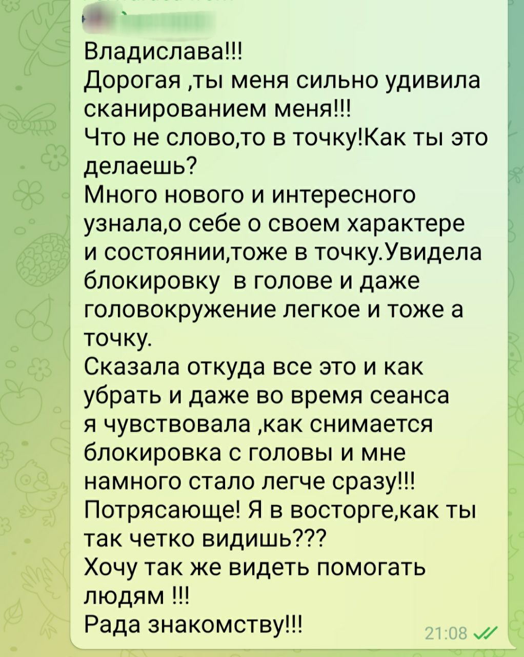 “Владислава!!! Дорогая ,ты меня сильно удивила сканированием меня!!! Что не слово,то в точку!Как ты это делаешь? Много нового и интересного узнала,о себе о своем характере и состоянии,тоже в точку.Увидела блокировку в голове и даже головокружение легкое и тоже а точку. Сказала откуда все это и как убрать и даже во время сеанса я чувствовала ,как снимается блокировка с головы и мне намного стало легче сразу!!! Потрясающе! Я в восторге,как ты так четко видишь??? Хочу так же видеть помогать людям !!! Рада знакомству!!!”