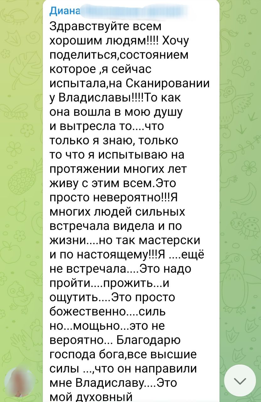 “Здравствуйте всем хорошим людям!!!! Хочу поделиться,состоянием которое ,я сейчас испытала,на Сканировании у Владиславы!!!!То как она вошла в мою душу и вытресла то....что только я знаю, только то что я испытываю на протяжении многих лет живу с этим всем.Это просто невероятно!!!Я многих людей сильных встречала видела и по жизни....но так мастерски и по настоящему!!!Я ....ещё не встречала....Это надо пройти....прожить...и ощутить....Это просто божественно....сильно...мощьно...это не вероятно... Благодарю господа бога,все высшие силы ...,что он направили мне Владиславу....Это мой духовный учитель,наставник,друг,это мощнейший человек, человек....своего дела!!!!Я желаю Владиславе силы ещё большей!!!!Процветания и здоровья на всем ее жизненном пути!!!Дай бог здоровья!!!! Благодарю, благодарю, благодарю!!!!За раскрытие ,за талант за все ,что делаете для нас!!!😇🙏👍❤”
