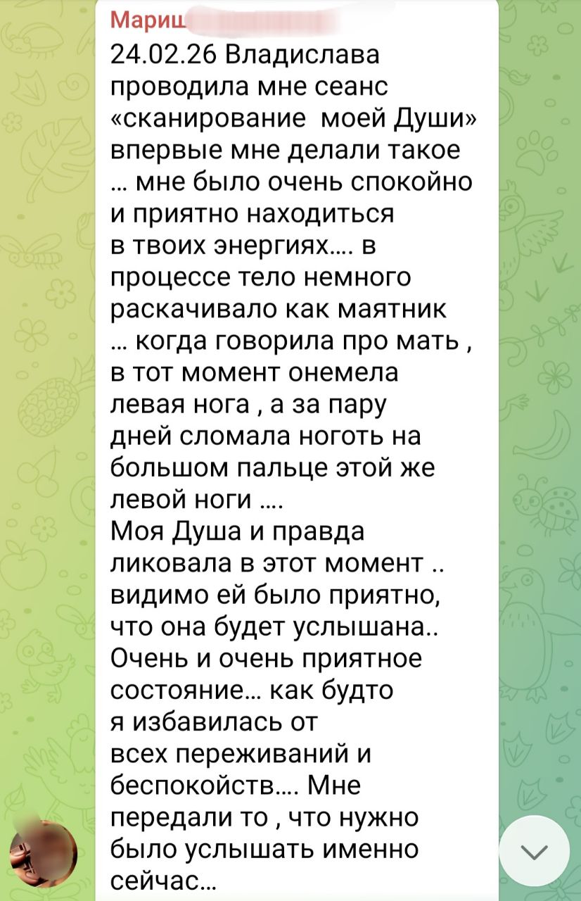 “24.02.26 Владислава проводила мне сеанс «сканирование моей Души» впервые мне делали такое … мне было очень спокойно и приятно находиться в твоих энергиях…. в процессе тело немного раскачивало как маятник … когда говорила про мать , в тот момент онемела левая нога , а за пару дней сломала ноготь на большом пальце этой же левой ноги …. Моя Душа и правда ликовала в этот момент .. видимо ей было приятно, что она будет услышана.. Очень и очень приятное состояние… как будто я избавилась от всех переживаний и беспокойств…. Мне передали то , что нужно было услышать именно сейчас… После окончания сессии , было такое ощущения , что я выйду на улицу, распахну руки , и полечу на крыльях … Весь день работала в приподнятом состоянии .. Очень интересный опыт сканирования Через время я бы повторила Благодарю Владочка,,,ты делаешь благостное дело Процветания тебе.”
