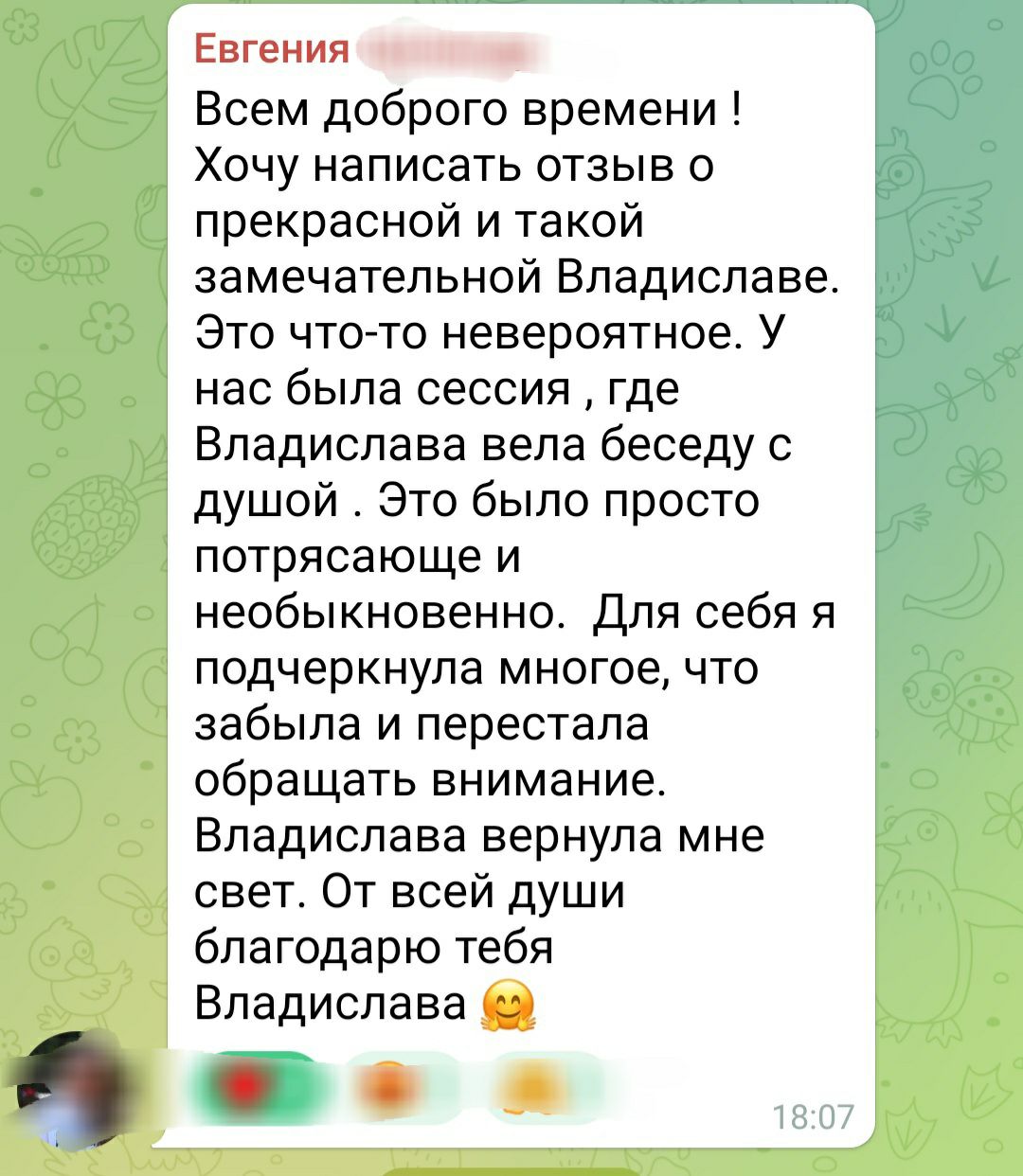 “Всем доброго времени ! Хочу написать отзыв о прекрасной и такой замечательной Владиславе. Это что-то невероятное. У нас была сессия , где Владислава вела беседу с душой . Это было просто потрясающе и необыкновенно. Для себя я подчеркнула многое, что забыла и перестала обращать внимание. Владислава вернула мне свет. От всей души благодарю тебя Владислава 🤗”