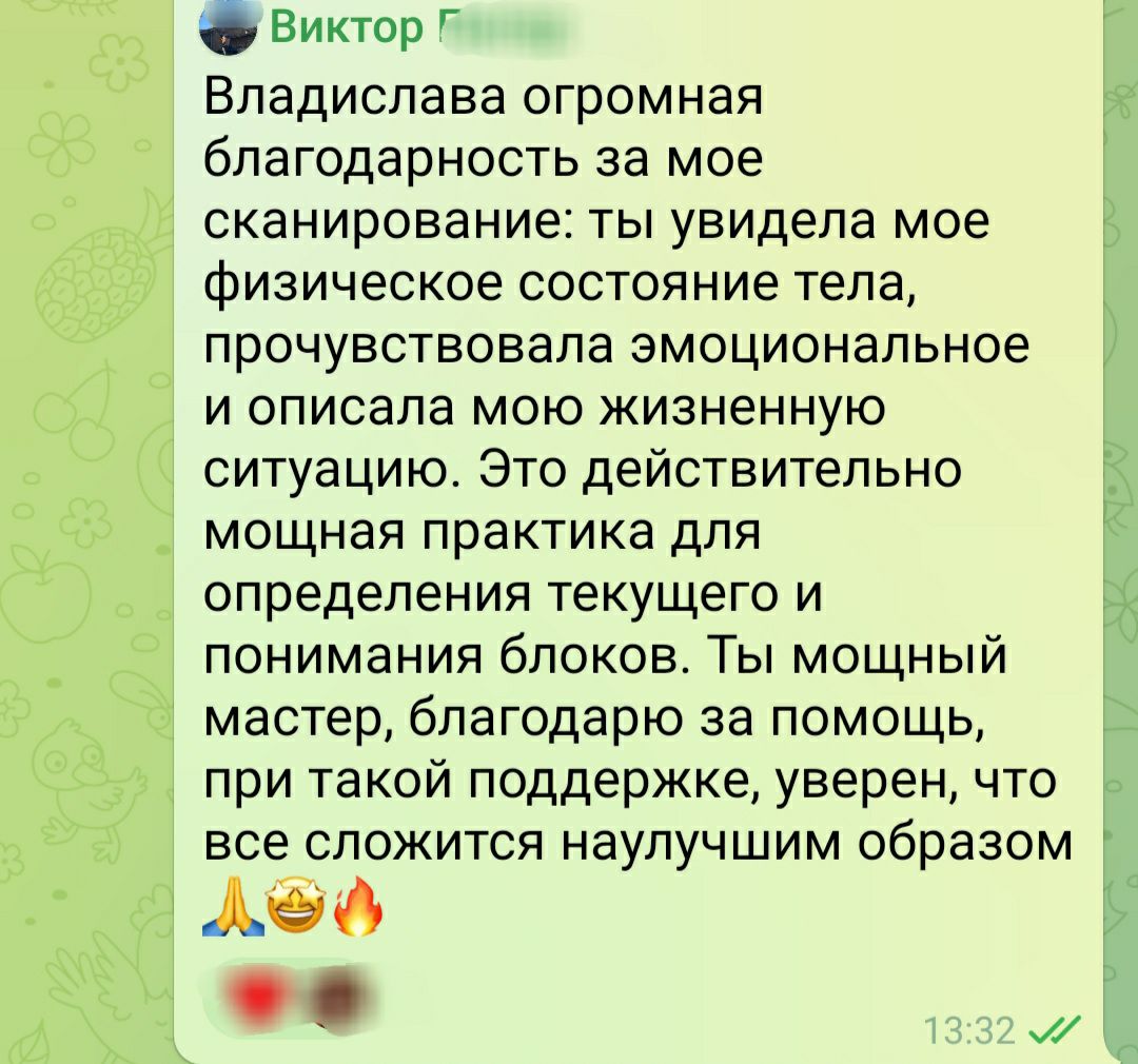 “Владислава огромная благодарность за мое сканирование: ты увидела мое физическое состояние тела, прочувствовала эмоциональное и описала мою жизненную ситуацию. Это действительно мощная практика для определения текущего и понимания блоков. Ты мощный мастер, благодарю за помощь, при такой поддержке, уверен, что все сложится наулучшим образом🙏🤩”