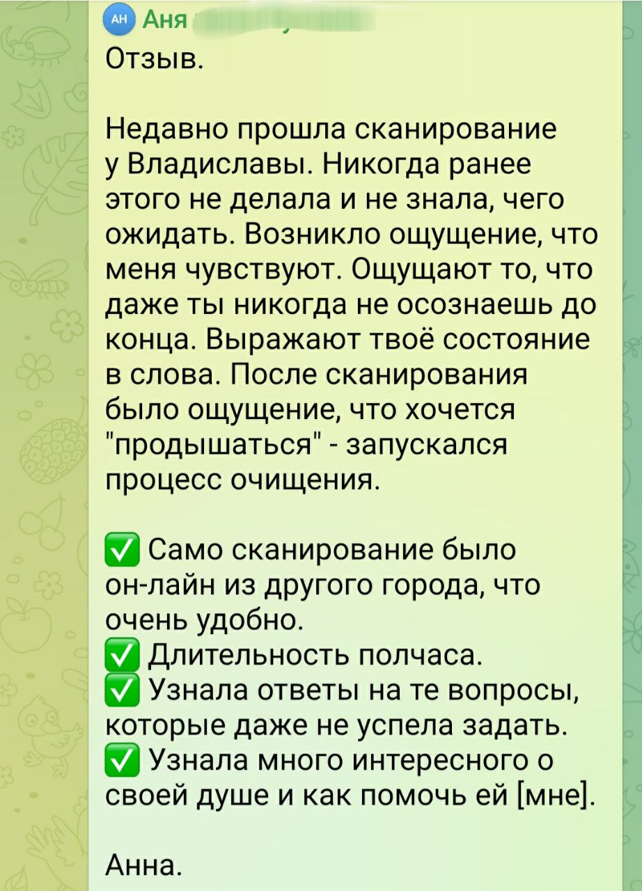 “Недавно прошла сканирование у Владиславы. Никогда ранее этого не делала и не знала, чего ожидать. Возникло ощущение, что меня чувствуют. Ощущают то, что даже ты никогда не осознаешь до конца. Выражают твоё состояние в слова. После сканирования было ощущение, что хочется "продышаться" - запускался процесс очищения. ✅ Само сканирование было он-лайн из другого города, что очень удобно. ✅ Длительность полчаса. ✅ Узнала ответы на те вопросы, которые даже не успела задать. ✅ Узнала много интересного о своей душе и как помочь ей [мне].”