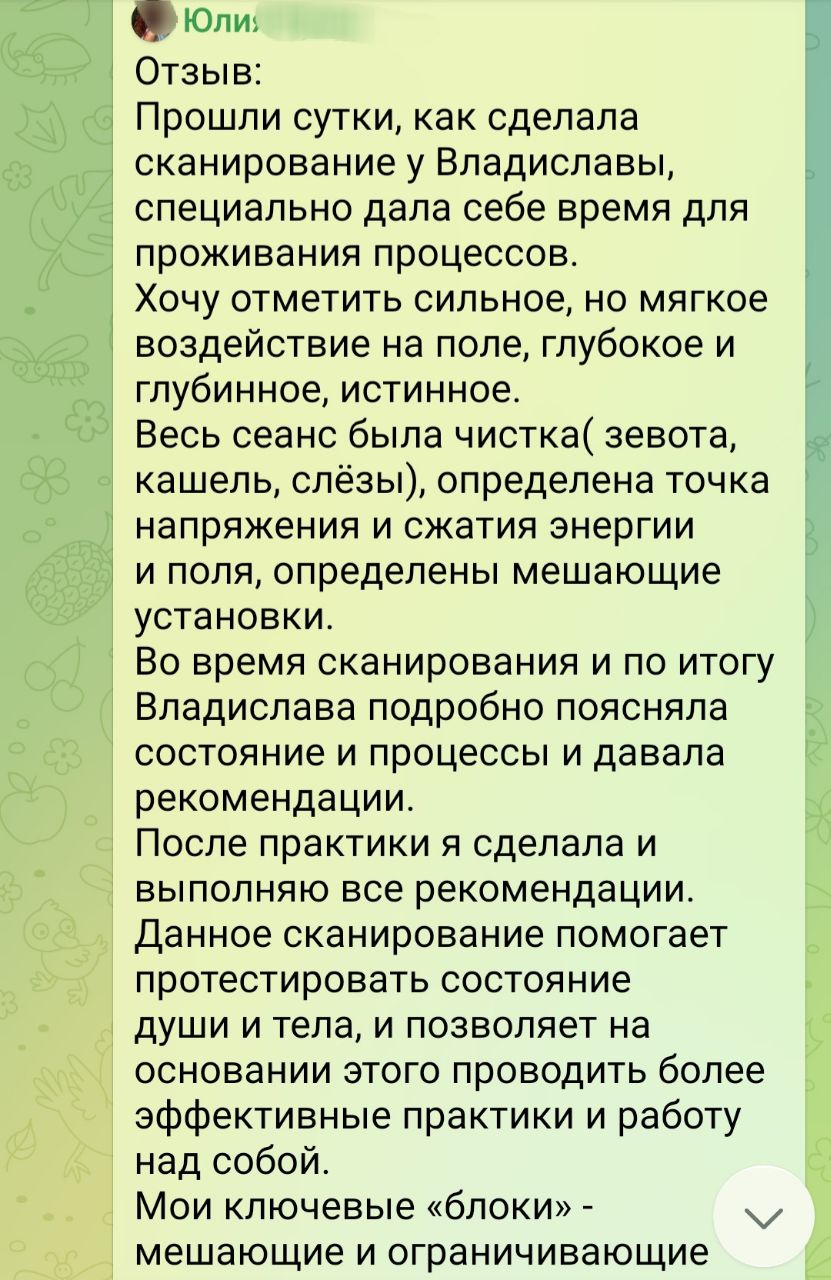 “Отзыв: Прошли сутки, как сделала сканирование у Владиславы, специально дала себе время для проживания процессов. Хочу отметить сильное, но мягкое воздействие на поле, глубокое и глубинное, истинное. Весь сеанс была чистка( зевота, кашель, слёзы), определена точка напряжения и сжатия энергии и поля, определены мешающие установки. Во время сканирования и по итогу Владислава подробно поясняла состояние и процессы и давала рекомендации. После практики я сделала и выполняю все рекомендации. Данное сканирование помогает протестировать состояние души и тела, и позволяет на основании этого проводить более эффективные практики и работу над собой. Мои ключевые «блоки» - мешающие и ограничивающие выявлены были точно на 1000000%. Рекомендую сканирование записывать на диктофон, что бы ни чего не упустить так как во время сеанса находишься в измененном состоянии и не все можешь записать/ услышать. От себя могу добавить, что в дальнейшем буду повторно обращаться к сканированию. Владислава благодарю за помощь и новый опыт.”