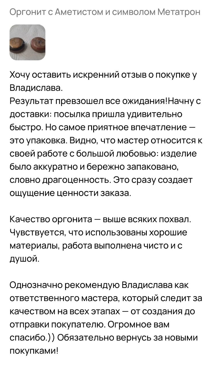 “Хочу оставить искренний отзыв о покупке у Владислава. Результат превзошел все ожидания!Начну с доставки: посылка пришла удивительно быстро. Но самое приятное впечатление — это упаковка. Видно, что мастер относится к своей работе с большой любовью: изделие было аккуратно и бережно запаковано, словно драгоценность. Это сразу создает ощущение ценности заказа. Качество оргонита — выше всяких похвал. Чувствуется, что использованы хорошие материалы, работа выполнена чисто и с душой. Однозначно рекомендую Владислава как ответственного мастера, который следит за качеством на всех этапах — от создания до отправки покупателю. Огромное вам спасибо.)) Обязательно вернусь за новыми покупками!”